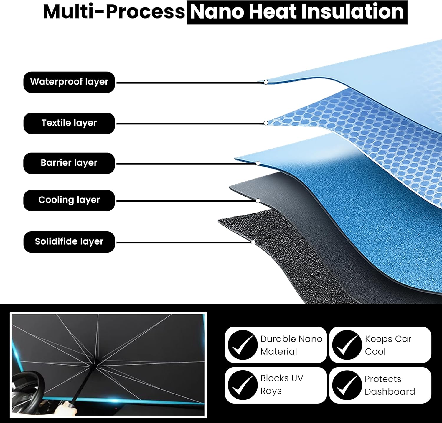 تعمل مظلة الزجاج الأمامي على عكس أشعة الشمس ومنع الأشعة فوق البنفسجية الضارة – لتبقى سيارتك باردة ومنعشة حتى في أشد الأيام حرارة
